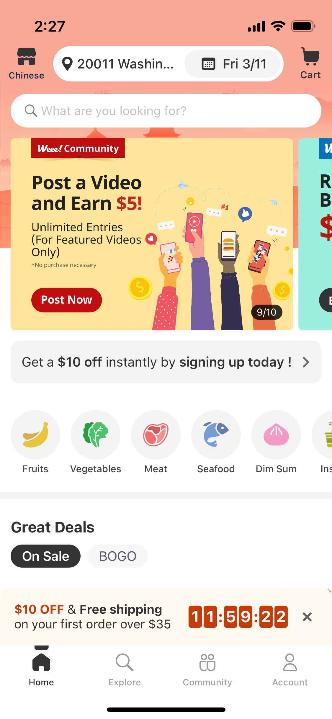 Aplikacja e-grocera zawiera filmy z możliwością zakupu na stronach poszczególnych produktów oraz w części „Społeczność”, w której użytkownicy mogą znaleźć treści przesłane przez innych użytkowników lub przez Weee. W tej sekcji „Społeczność” użytkownicy mogą znaleźć ograniczone czasowo, tematyczne konkursy na filmy wideo, które można kupić, z kartami podarunkowymi oferowanymi jako nagrodami (5 USD za każdy polecany film i 20 USD dla pięciu zwycięzców wybranych przez Weee).
