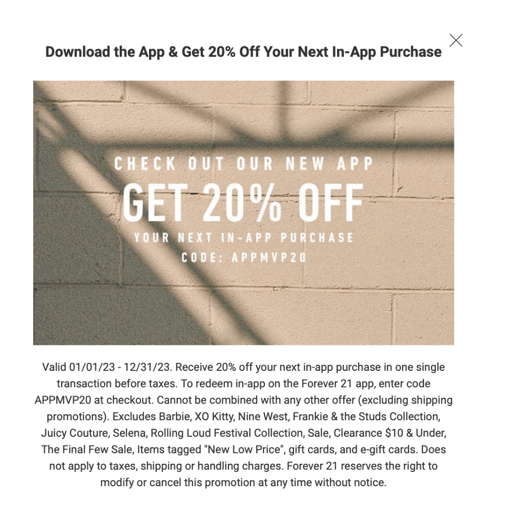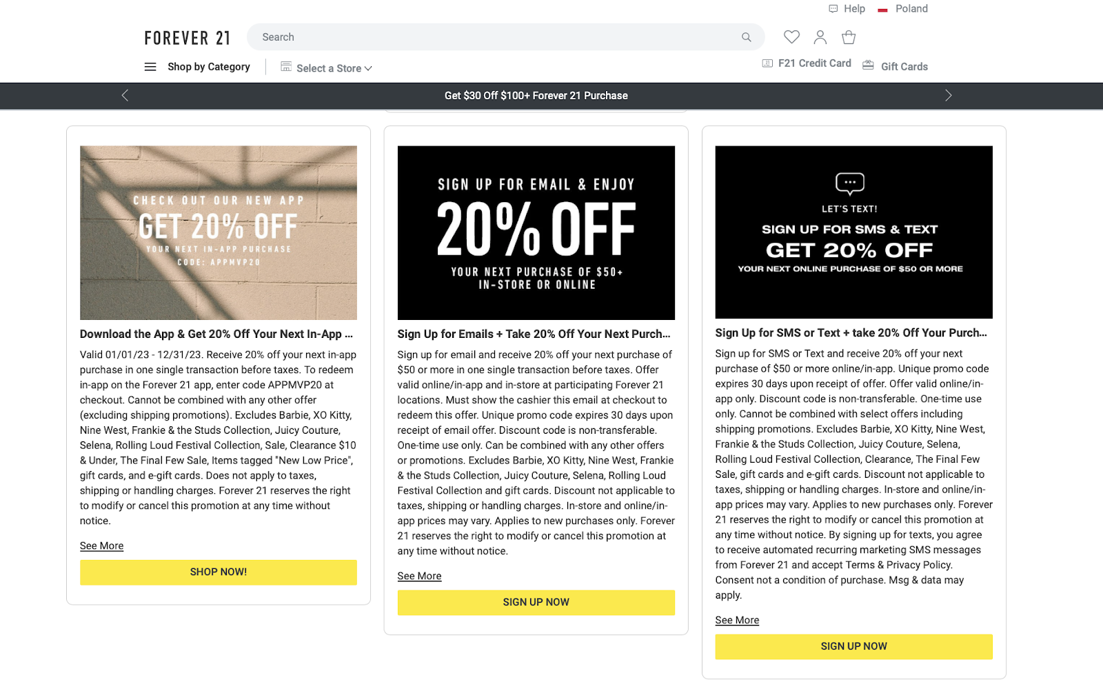 Forever 21 prezentuje swoje dostępne oferty, w tym kody kuponów promocyjnych, w dedykowanej przestrzeni z interfejsem użytkownika zaprojektowanym tak, aby był łatwy do zrozumienia. Architektura informacji serwisu skutecznie wykorzystuje aspekty wizualne do podkreślenia określonych aspektów ich oferty. Aby dowiedzieć się więcej o konkretnej promocji, klienci mogą kliknąć przycisk „zobacz więcej”, w którym znajduje się lista warunków dotyczących poszczególnych promocji, takich jak ograniczenia czasowe, zasady wykluczeń, kryteria realizacji, zasady wysyłki i odpowiedzi, na przykład, kwestia łączenia różnych promocji.