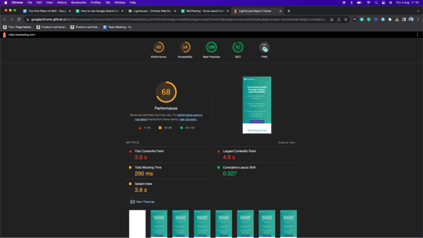 To jest raport Lighthouse, który właśnie uruchomiłem na stronie SEOTesting. Jak widać, ma ogólny wynik 68, więc jest kilka obszarów do poprawy.