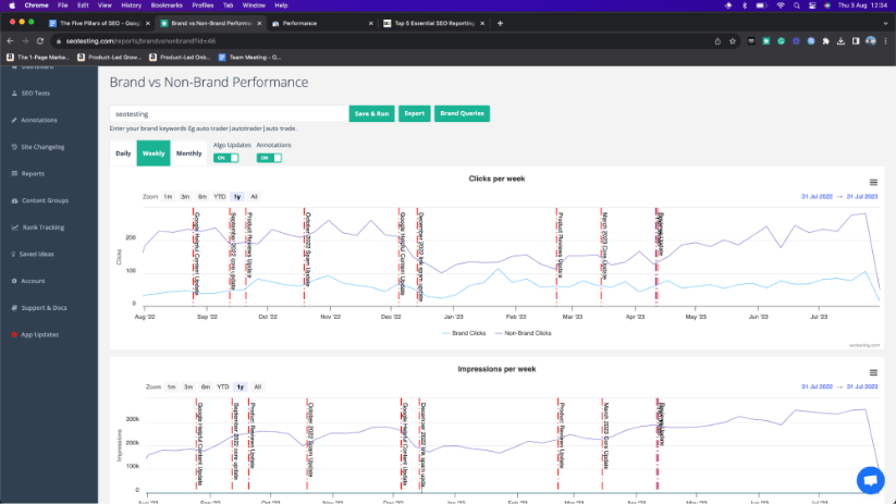 Istnieją inne narzędzia, które można wykorzystać do raportowania, na przykład SEOTesting i AgencyAnalytics, które działają dobrze w swoich obszarach. AgencyAnalytics ułatwia szybkie sprawdzenie, jak Twoja witryna radzi sobie w wynikach wyszukiwania i pod innymi względami. SEOTesting oferuje szereg raportów, które możesz kliknąć i natychmiast przejść do przydatnego raportu, który pomoże Ci przekazać wiadomość. Świetnym przykładem jest raport „Marka kontra niemarka”. Jednym kliknięciem możesz zobaczyć dokładnie, jak sobie radzisz w wyszukiwaniu według marki i wyszukiwaniu niezwiązanym z marką: