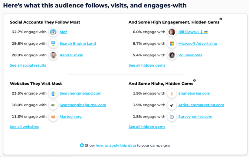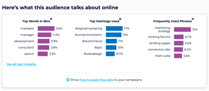 Teraz możemy zobaczyć, jak wyglądają nasi odbiorcy (tytuły w ich rolach zawodowych), możemy zobaczyć, jakich hashtagów często używają, możemy zobaczyć frazy, których często używają:
