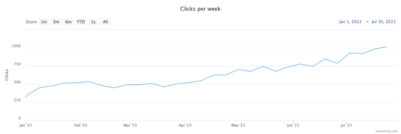 To dzięki ciągłemu doskonaleniu i optymalizacji byliśmy w stanie zapewnić stały wzrost witryny SEOTesting. Nasza strona wzrosła od 0 do ponad 4000 organicznych kliknięć miesięcznie w ciągu nieco ponad trzech lat.