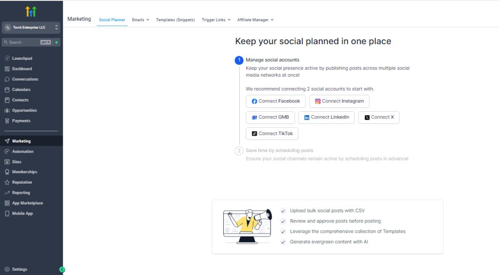 - Dystrybucja treści : użyj GoHighLevel do planowania i publikowania treści w różnych kanałach.