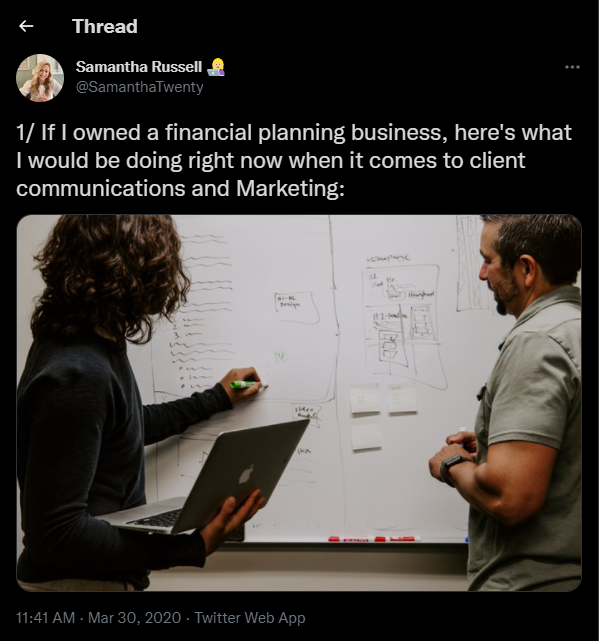 Tak więc taktyka numer jeden polega na tworzeniu treści wokół aktualnych tematów, o których Twoi odbiorcy już aktywnie rozmawiają. Wydaje się to dość intuicyjne, ale w rzeczywistości ludzie nie wykorzystują tego tak bardzo, jak powinni. Na przykład w 2021 roku, na początku 2021 roku, sugerowałem, że tworzenie treści wokół kryptowalut będzie najlepszą okazją marketingową dla doradców. Właśnie z tego powodu. Ludzie czytają o tym w wiadomościach. Chcą wiedzieć, gdzie tracą. Czy nadszedł czas, aby kupić dip? Dobrze? Więc nawet jeśli nie polecasz kryptowalut swoim klientom, samo tworzenie treści wokół niego pomoże Ci łatwiej się dzielić. Dobrze? Oto kolejny przykład z tego, kiedy pandemia właśnie zaczęła się w marcu 2020 r., Stworzyłem ten wątek na Twitterze, a następnie przekształciłem go w post na blogu i film zatytułowany Gdybym był właścicielem firmy zajmującej się planowaniem finansowym właśnie teraz, oto dokładnie to, co zrobiłbym teraz . I przedstawiłem dziesięć kroków marketingowych, które podejmę, aby dostosować się do tej nowej normalności podczas pandemii. I to było naprawdę dobrze przyjęte, ponieważ było tak na czasie.