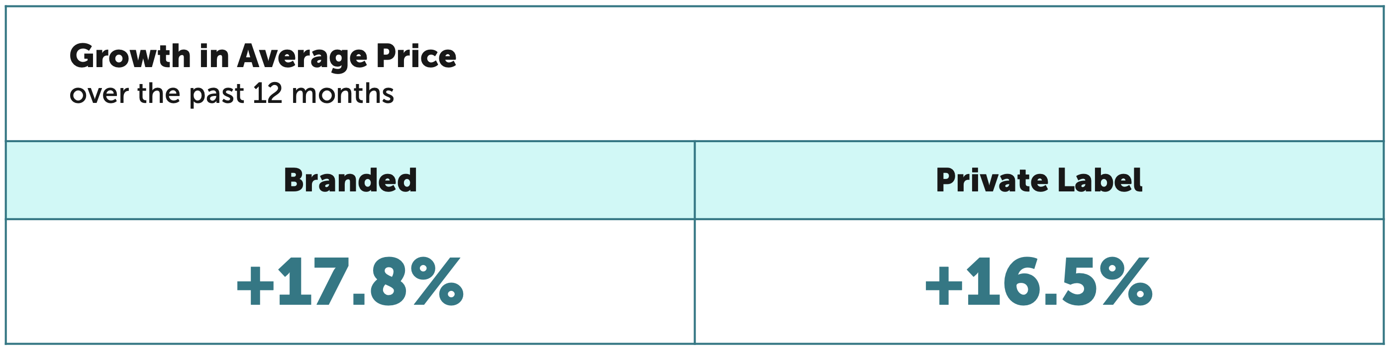 W ciągu ostatnich 12 miesięcy, w oparciu o dane IPN , całkowity wzrost średniej ceny we wszystkich kategoriach był znacznie wyższy w przypadku SKU oznaczonych marką niż w przypadku marek własnych.
