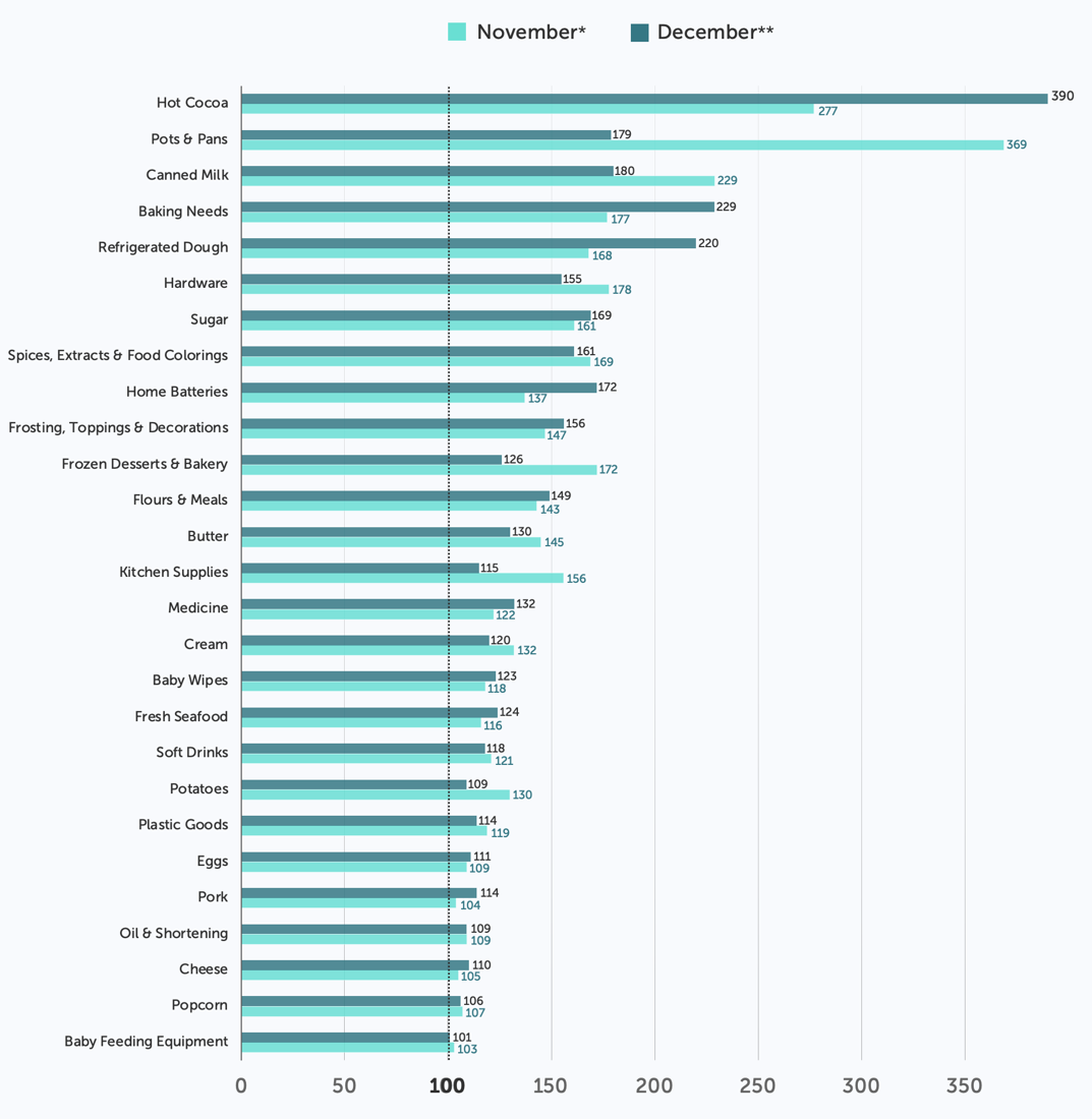 Marki, które w dużym stopniu polegają na sprzedaży w listopadzie i grudniu, powinny nadal oczekiwać dużej sprzedaży w ramach tych kategorii CPG food & bev . Będą jednak musieli unikać utraty udziału na rzecz marek własnych i marek konkurencyjnych, ponieważ kupujący stają się coraz bardziej selektywni, jeśli chodzi o znalezienie właściwych produktów w odpowiedniej cenie.
