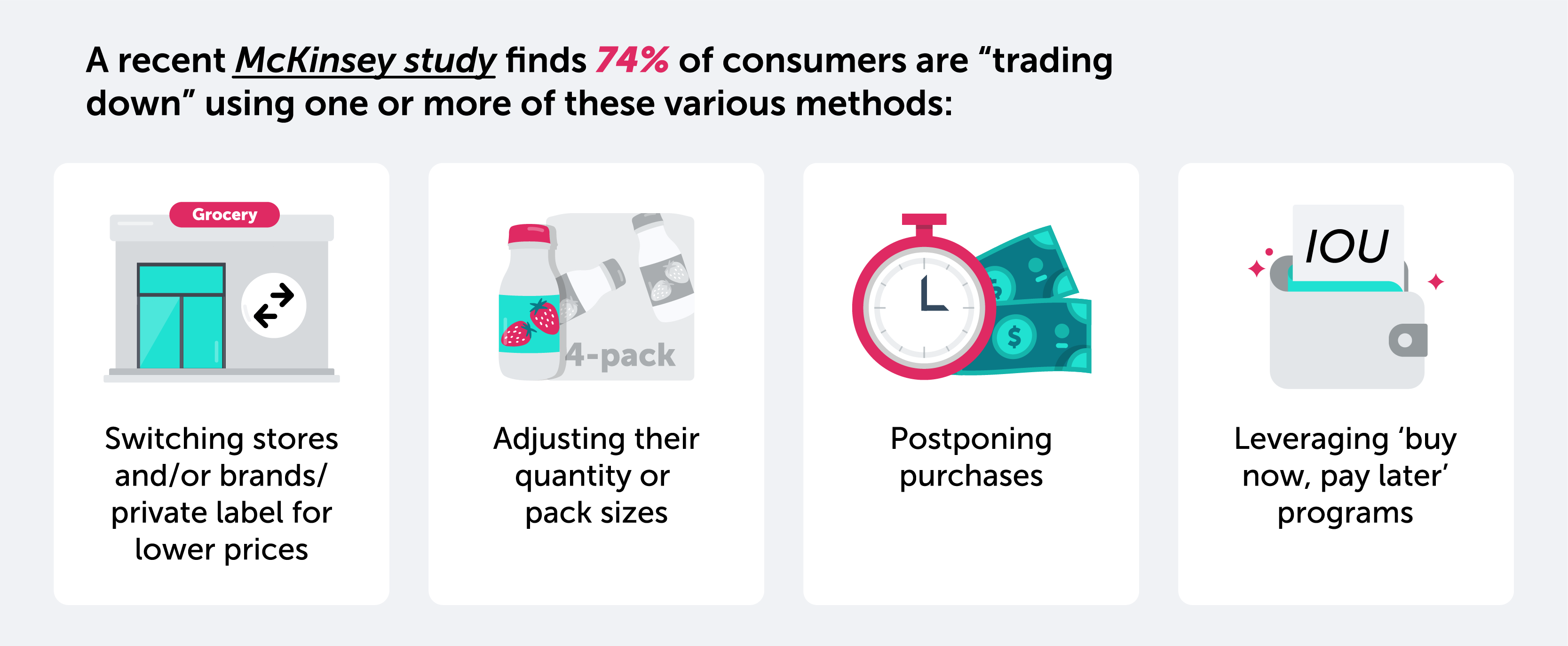 W rzeczywistości 91% kupujących twierdzi, że sama inflacja wpłynie na ich zachowania związane z zakupami świątecznymi. Inne czynniki, od problemów z łańcuchem dostaw po zmieniające się ceny gazu i rosnące stopy procentowe, również powodują, że kupujący zmniejszają budżety świąteczne. Niedawne badanie McKinsey wykazało, że 74% konsumentów „handluje” przy użyciu jednej lub kilku z poniższych metod: