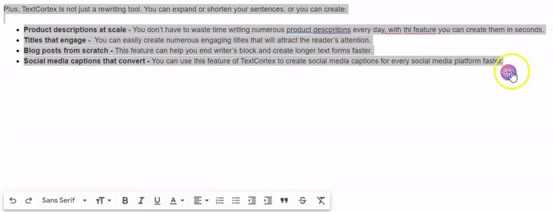 TextCortex to rozszerzenie przeglądarki Chrome, którego można użyć do przeformułowania zarówno zdań , jak i dłuższych fragmentów tekstu , za pomocą jednego kliknięcia.
