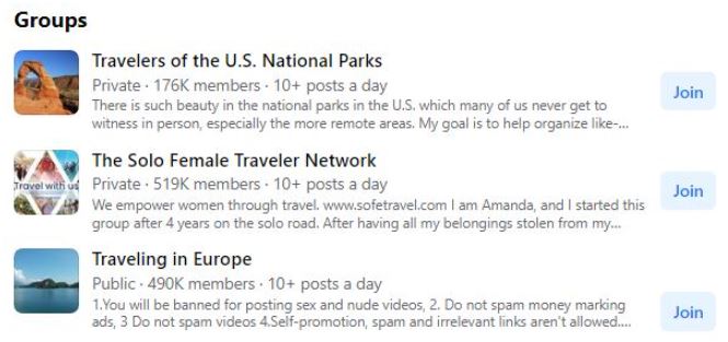 Wpisz „podróżnicy” w wyszukiwarce na Facebooku, a zostaniesz przekierowany do tak wielu grup podróżniczych, które — zrozum to — TYSIĄCE , jeśli nie MILIONY obserwujących.