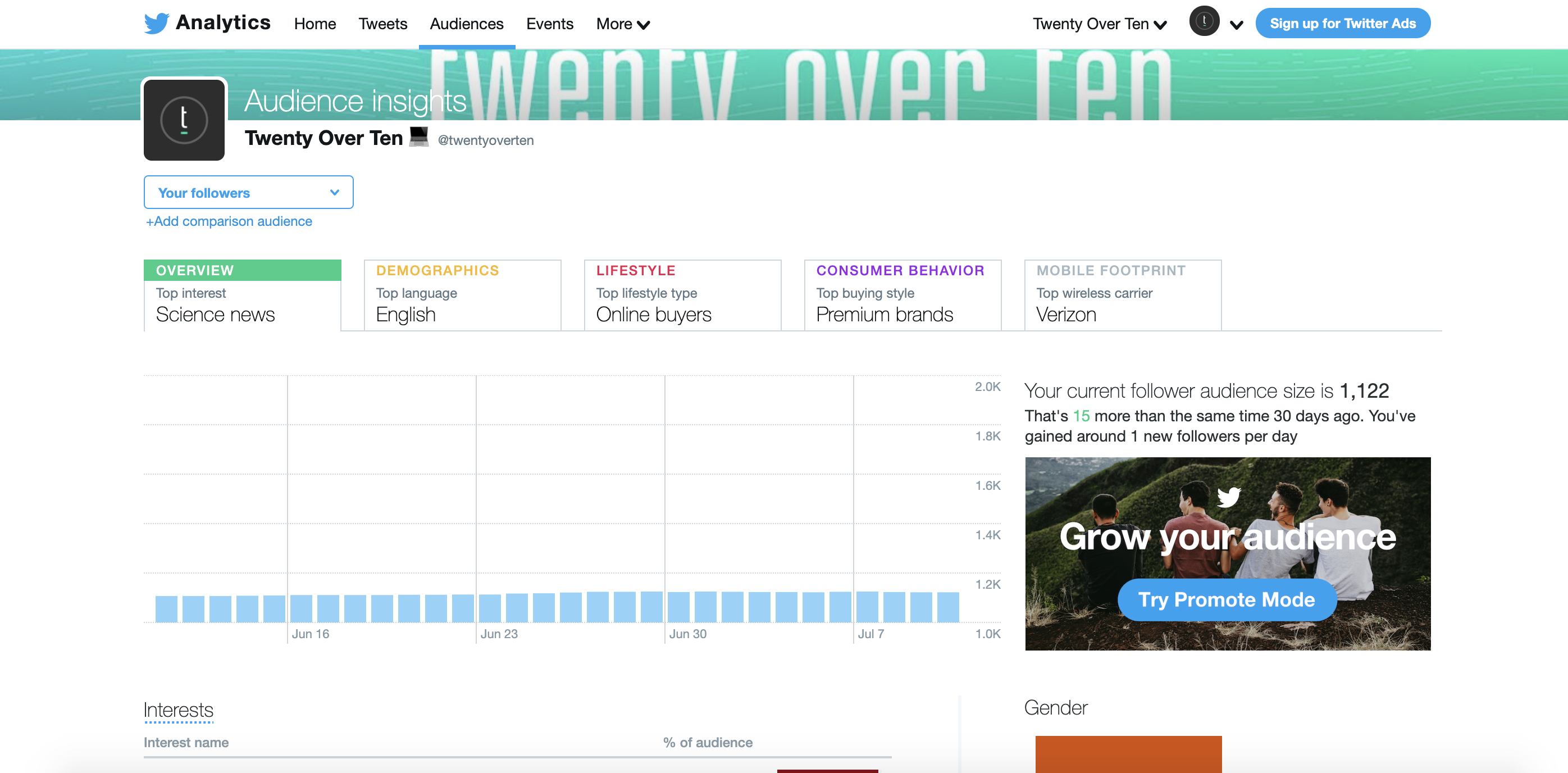 Poniższy zrzut ekranu ilustruje dane analityczne dla konta Twenty Over Ten na Twitterze. Analytics wskazuje takie rzeczy, jak płeć, styl życia, najważniejsze zainteresowania itp. Twoich obserwujących. Twoje dane analityczne pomogą Ci lepiej określić, do kogo powinieneś się zatroszczyć na swoich platformach społecznościowych.