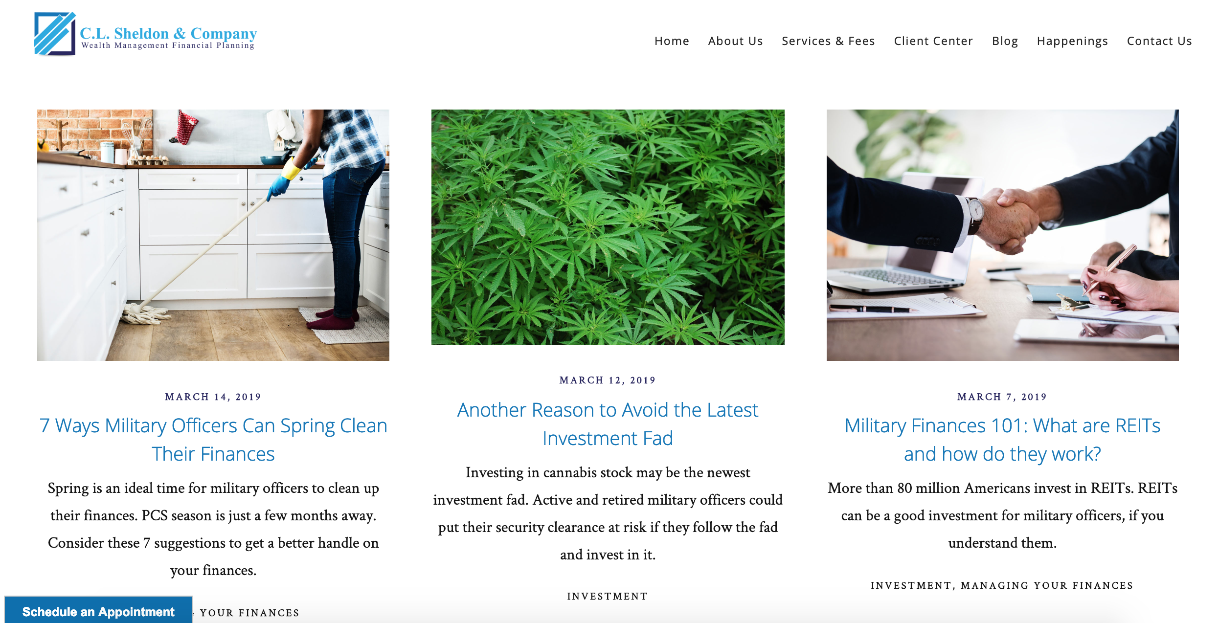 W poniższym przykładzie klient Twenty Over Ten, CL Sheldon & Company, tworzy spójne treści na swoim blogu, dostosowane do ich niszy oficerów wojskowych. Dostarczając na swoim blogu konkretne treści, które przynoszą korzyści ich docelowym odbiorcom, pokazują wyjątkową wartość, jaką zapewniają swojej niszy.