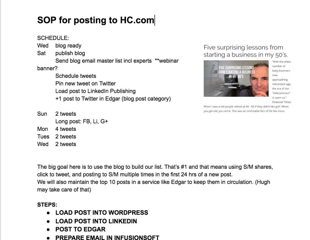 Aby rozpocząć, skorzystaj z Dokumentów Google (możesz je łatwo udostępnić, gdy chcesz zlecić to na zewnątrz) i po prostu wymień wszystkie kroki, których wymaga Twój proces blogowania. Następnie zidentyfikuj powtarzające się zadania, które możesz zlecić na zewnątrz. Na przykład możesz zlecić tworzenie wyróżnionego obrazu dla każdego posta.