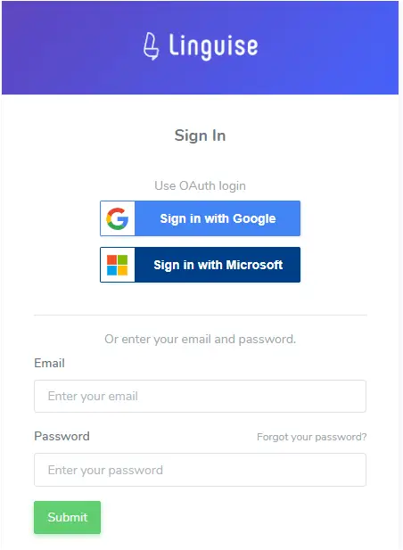 Aby zarejestrować się w linguise i korzystać z jego wielojęzycznej wtyczki, musisz wejść na oficjalną stronę Linguise.com, wpisać swój adres e-mail i hasło (mocne, ale łatwe do zapamiętania) i kliknąć Prześlij.