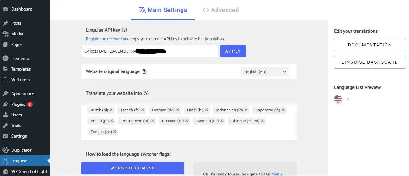 Teraz odwiedź stronę ustawień wtyczki, klikając „Ikonę języka” wyświetlaną w menu po lewej stronie paska bocznego. Otwiera stronę ustawień linguise i tutaj musisz wkleić klucz API domeny, który wygenerowałeś ze strony domeny linguise.