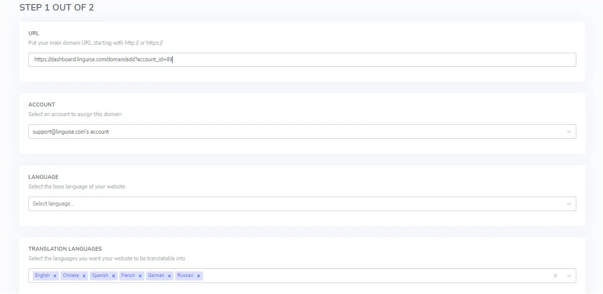 Po utworzeniu konta w linguise musisz dodać nazwę domeny, aby móc zacząć generować wielojęzyczny tekst dla swojej witryny.