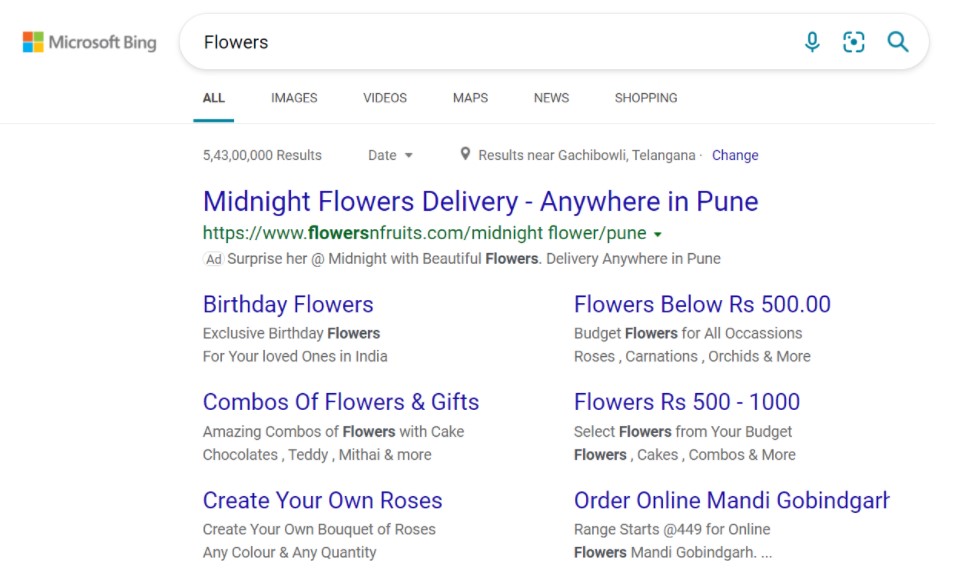 Podobnie jak ich odpowiednik w Google Ads, reklamy Microsoft Search pojawiają się na stronach wyników wyszukiwania, gdy potencjalni klienci wyszukują Twoje słowa kluczowe.