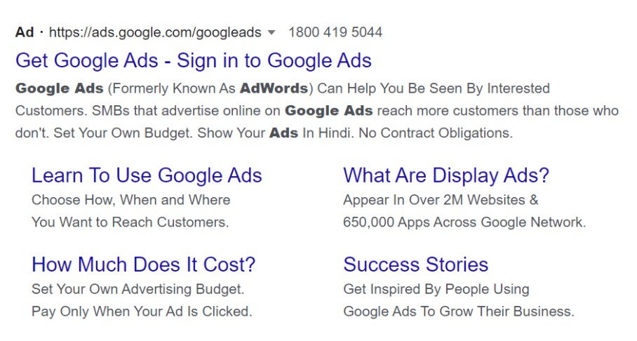 Gdy użytkownik wpisze terminy, które są ściśle związane z tytułami i wyrażeniami często używanymi w Twojej witrynie, Google wyświetla mu reklamę, wybierając odpowiednie nagłówki i strony docelowe z Twojej witryny.