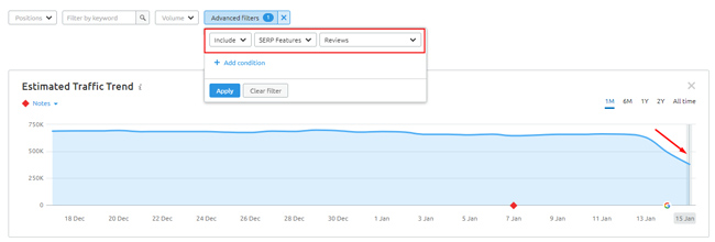 A oto, w jaki sposób narzędzie widoczności może z czasem wychwycić spadki lub wzrosty w opisach rozszerzonych. Korzystając z narzędzia takiego jak Semrush, możesz filtrować według różnych typów funkcji wyszukiwania, aby wyświetlić trendy w czasie. Ta witryna utraciła fragmenty recenzji wraz z szeroką aktualizacją rdzenia ze stycznia 2020 r.