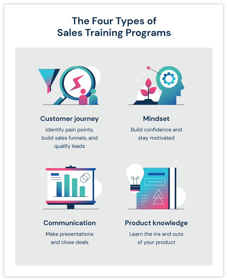 Istnieje wiele różnych programów sprzedaży, które można ogólnie podzielić na cztery kategorie: podróż klienta, sposób myślenia, komunikacja i wiedza o produkcie.