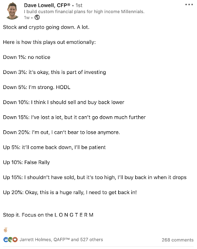 Niedawno, gdy wszystko szło w górę i w dół z kryptowalutami pod koniec stycznia 2022 r., ma świetny post, który informuje o aukcjach kryptowalut. Oto, jak to rozgrywa się emocjonalnie, a on zaczyna zabierać cię na przejażdżkę kolejką górską, w której czujesz się jako inwestor. Dobrze? Działa, ponieważ łączy się z naszą emocjonalną reakcją, którą wszyscy razem mamy, jeśli obserwujemy, co dzieje się z krypto. A więc tylko dwa przykłady tego, jak nie nudzić się w kanałach społecznościowych.