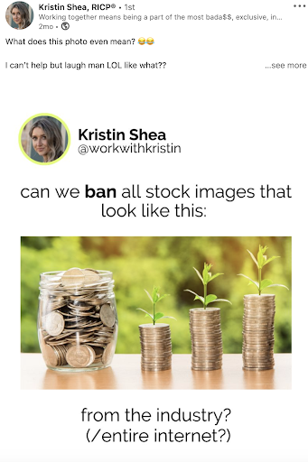 Kolejny świetny przykład z Kristen tutaj. Powiedziała, czy możemy zablokować wszystkie obrazy stockowe, które wyglądają tak, prawda? Kontrowersyjne opinie, które sprawią, że ludzie będą mówić.