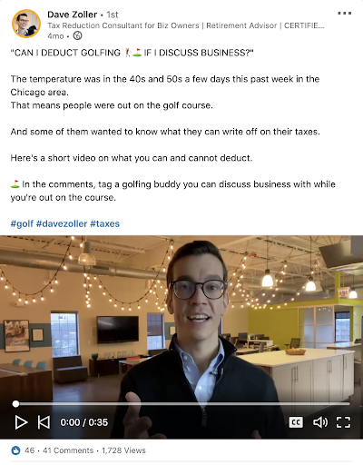 Mówi: Czy mogę odliczyć grę w golfa, jeśli rozmawiam o interesach? Temperatura w Chicago rośnie, a ludzie trafiają na linki. A potem mówi, oto krótki film o tym, co możesz, a czego nie możesz omawiać w komentarzach. Oznacz kolegę golfa, z którym możesz porozmawiać o interesach. Dobrze? Więc co daje ten post? Dobrze? Mówi o bieżących wydarzeniach, które dzieją się lokalnie. Dobrze? W Chicago temperatury się ocieplają. Jest również bardzo ukierunkowany na swoich odbiorców, którymi są właściciele firm. Więc będą chcieli poznać odpowiedź na to pytanie, czy mogę to odliczyć od moich podatków? A potem, oczywiście, pomysł, że mówi „Taguj kumpla od golfa”, z którym możesz porozmawiać o interesach, również bardzo pomaga, ponieważ ludzie zaczną oznaczać swoich znajomych w poście. Oto kolejny przykład od Dave'a Lowella.