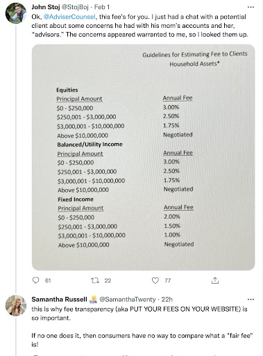 A numer pięć, ostatni, to to, że nie masz zdania. Każdy chce być znany jako lider myśli, ale nikt nie chce dzielić się opinią, z którą inni będą krytykować lub się z nią nie zgadzać. Nie możesz mieć tego w obie strony. Musisz mieć opinię, żeby ludzie mogli rozpocząć tę rozmowę, prawda? Więc jeśli wszystko, co publikujesz, jest stwierdzeniem, z którym wszyscy już się zgadzają, nie jesteś liderem myśli. Nienawidzę mówić, że jesteś zwolennikiem myśli i możesz dostać kilka kciuków za swoje posty, ale to nie zbuduje rozmowy i nie rozpocznie dialogu. Treści, które nas angażują, to treści, które skłaniają nas do myślenia lub które przeformułują coś, o czym myśleliśmy w nowy sposób. Musisz mieć głos, jeśli zapytasz dowolnego eksperta od PR, jak jesteś cytowany przez dziennikarzy, powie ci, że masz inne zdanie niż wszyscy inni, z którymi dziennikarz będzie rozmawiał. Oto kolejny przykład z Twittera od Johna, który zrobił zrzut ekranu czyjegoś harmonogramu opłat i zaczął całą rozmowę o tym, jakie są odpowiednie opłaty dla doradców.