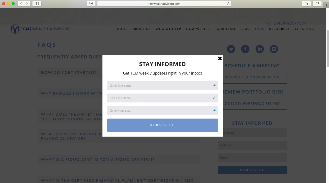TCM Wealth Advisors umieścili na swojej stronie internetowej wyskakujące okienko, które pojawia się po około 30 sekundach przebywania na stronie. Wiele usług związanych z wyskakującymi okienkami daje możliwość ustawienia licznika czasu, który określa, kiedy wyskakujące okienko pojawi się w Twojej witrynie, dzięki czemu możesz określić, którzy odwiedzający witrynę widzą wyskakujące okienko, na podstawie tego, ile czasu spędzili w Twojej witrynie.