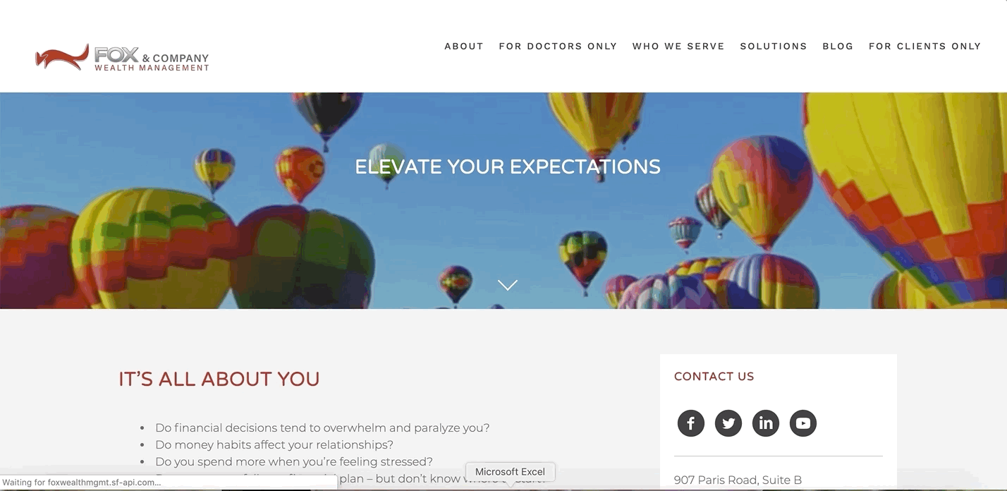 Wyskakujące okienko Fox & Company Wealth Management „Get in Touch Now” pojawia się natychmiast, co przyciąga uwagę widza. Wyskakujące okienko prowadzi widza do miejsca, w którym może umówić się na spotkanie. Pamiętaj, wyskakujące okienka mają pomóc widzom uprościć rzeczy! Im szybciej wyskakujące okienko pojawi się na Twoim landingu , stronie głównej lub innej stronie Twojej witryny, tym szybciej będziesz mieć szansę na konwersję większej liczby leadów. Cały sens wyskakującego okienka polega na skierowaniu widza tam, gdzie musi się udać, aby się zarejestrować lub zaplanować spotkanie, spotkanie itp.