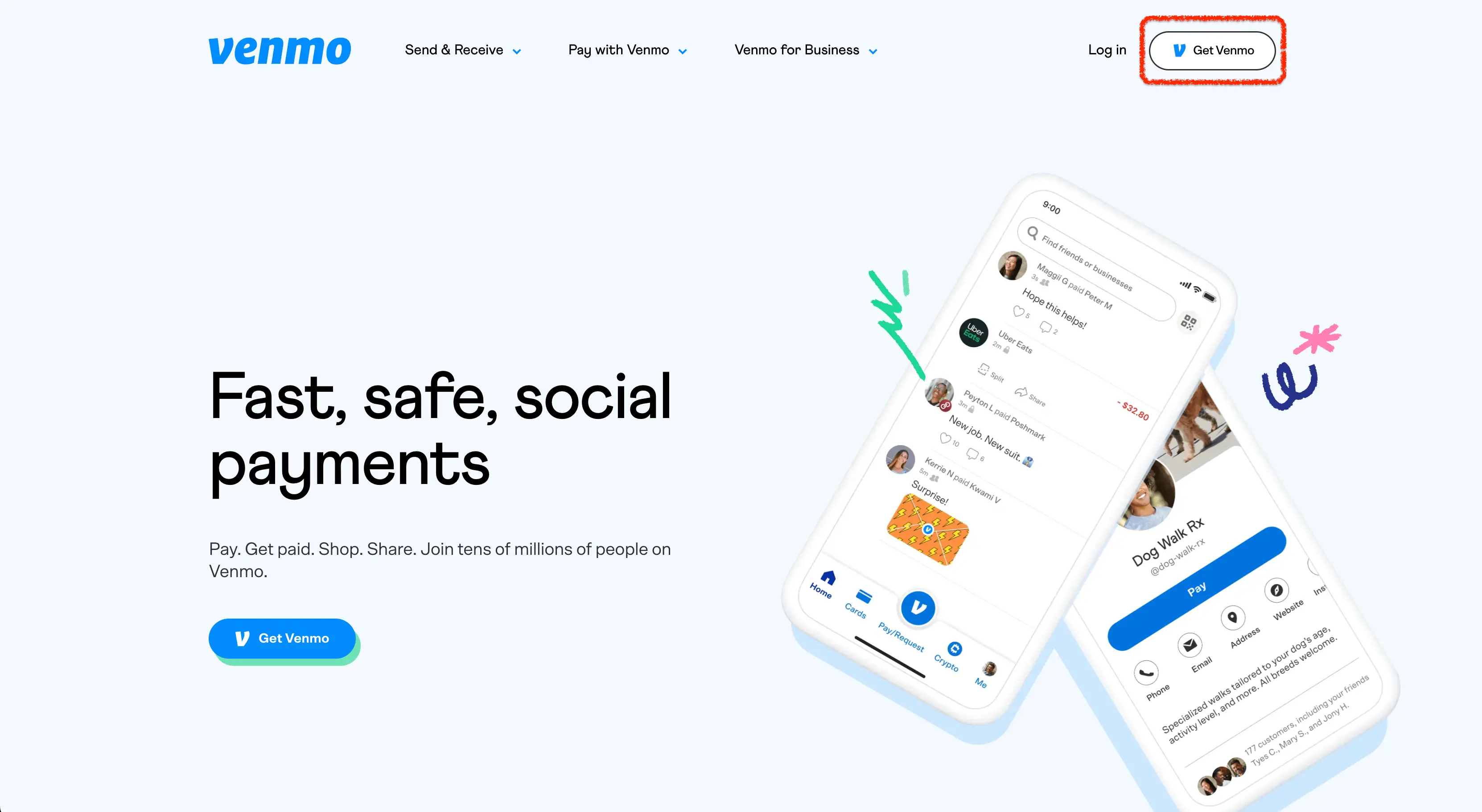 Jeśli masz już konto osobiste na Venmo, po prostu zaloguj się i przejdź do następnego kroku. Jeśli nie, przejdź do Venmo.com i kliknij „Get Venmo” w prawym górnym rogu ekranu.