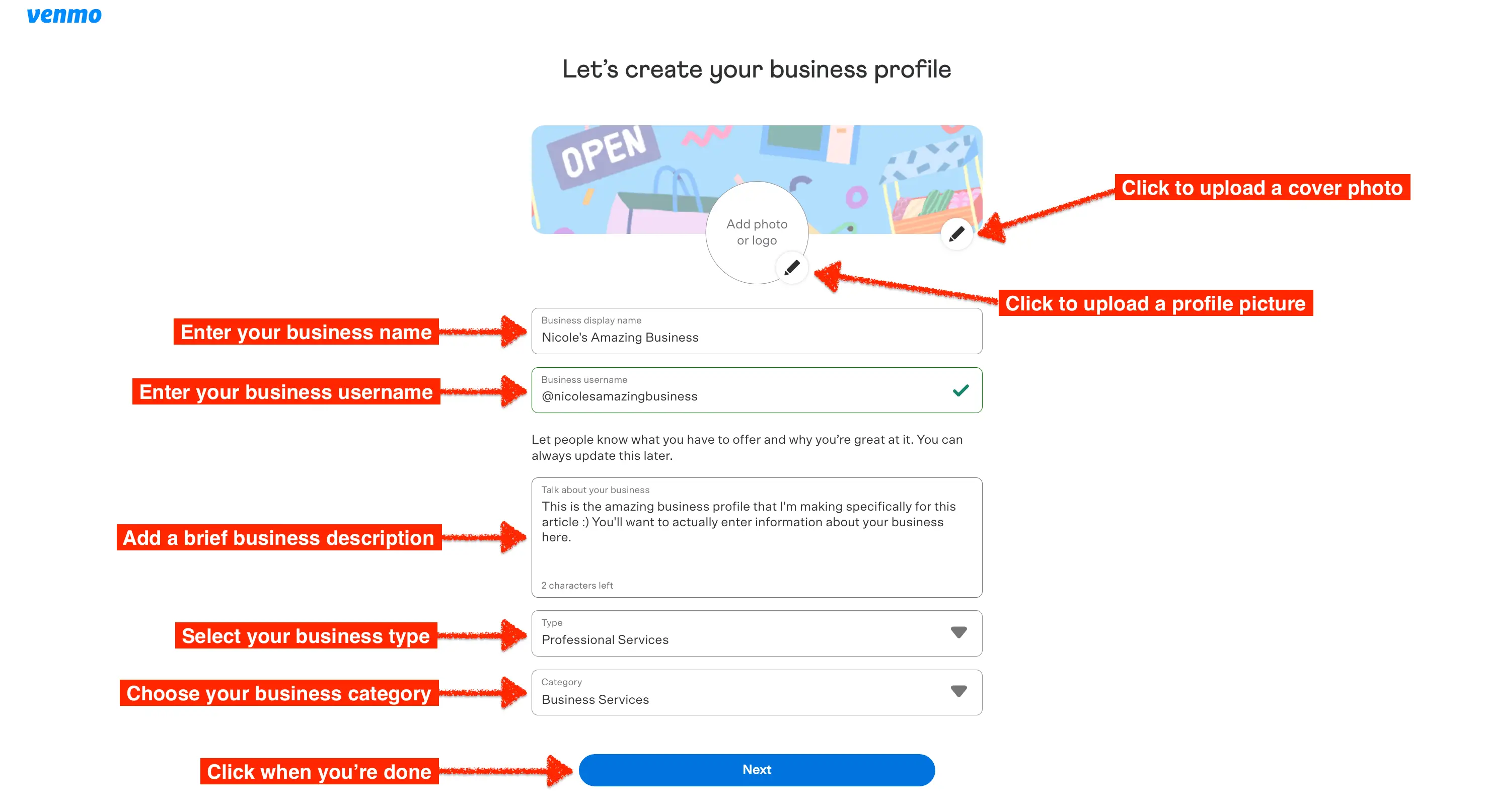 Venmo for Business umożliwia handlowcom założenie konta i przyjmowanie płatności od klientów za pośrednictwem aplikacji Venmo. Sprzedawcy mogą tworzyć faktury lub wysyłać żądania płatności, a klienci mogą płacić za pomocą salda Venmo, połączonego konta bankowego lub karty debetowej / kredytowej.