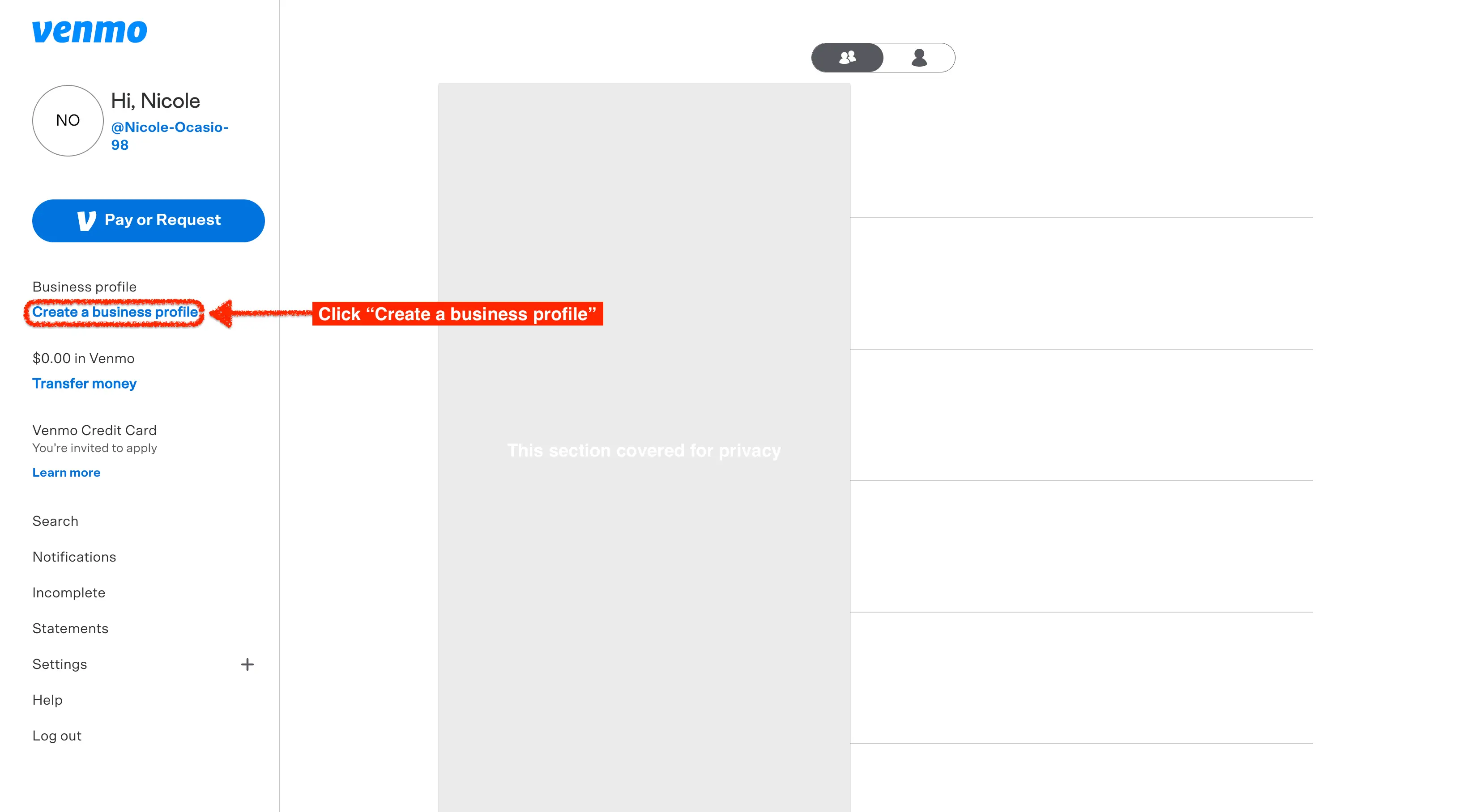 Na swoim osobistym koncie Venmo kliknij „Utwórz profil biznesowy” na lewym marginesie.