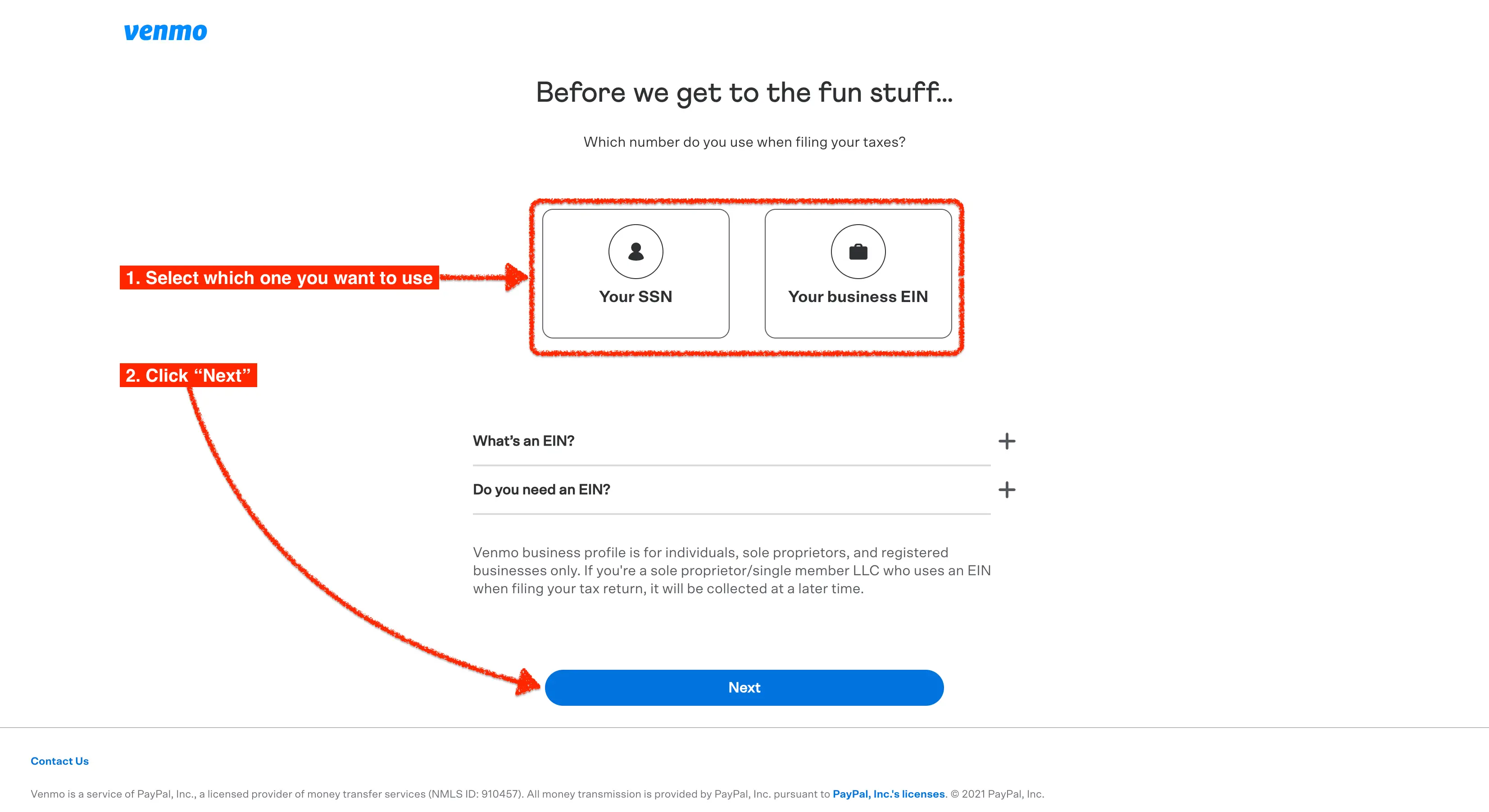Wybierz numer, którego chcesz używać do celów podatkowych. Możesz użyć swojego numeru ubezpieczenia społecznego (SSN) lub numeru identyfikacyjnego pracodawcy (EIN). Po dokonaniu wyboru kliknij „Dalej”.