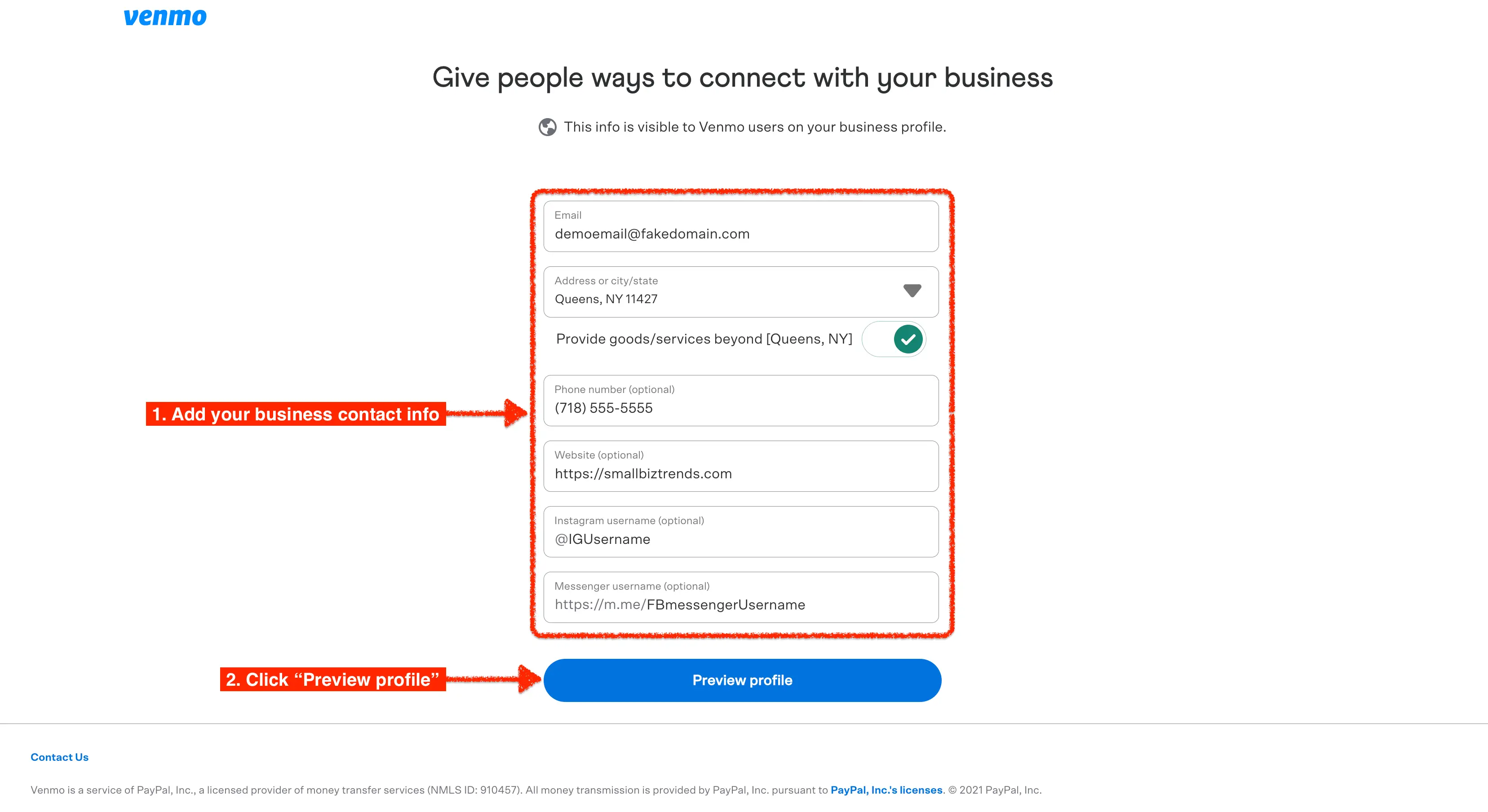 Na tej stronie możesz dodać sposoby nawiązywania kontaktów z Twoją firmą. Możesz dodać swój adres e-mail, adres, numer telefonu, stronę internetową, nazwę użytkownika Instagram i nazwę użytkownika Messenger. Te informacje będą widoczne dla innych użytkowników Venmo w profilu Twojej firmy, więc miej to na uwadze podczas dodawania informacji kontaktowych do tej strony. Kliknij „Podgląd profilu”, gdy skończysz.