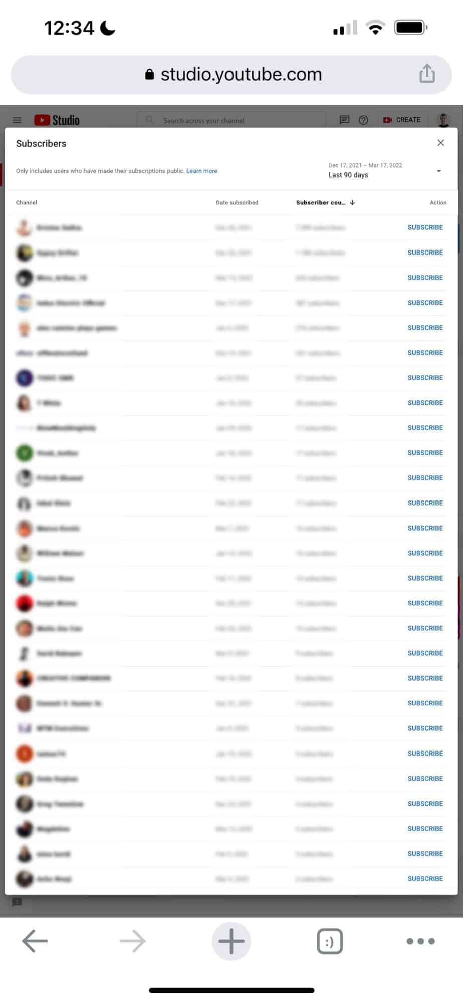 Możesz zobaczyć swoich subskrybentów za pośrednictwem witryny YouTube Studio w przeglądarce mobilnej.