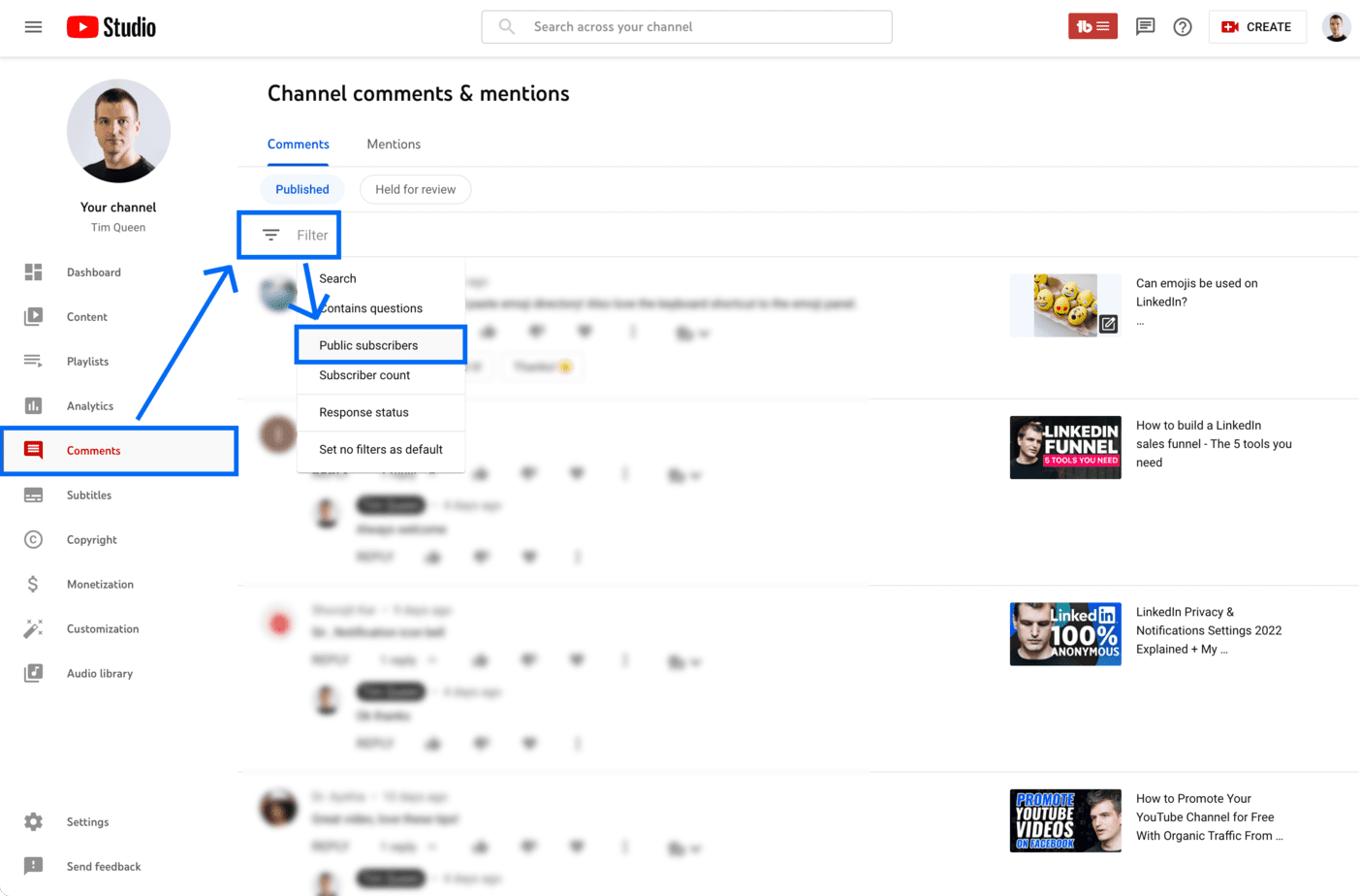 Kolejnym hackiem, który pomaga zobaczyć swoich subskrybentów YouTube, zwłaszcza tych najbardziej aktywnych, jest użycie narzędzi do komentarzy w YouTube Studio.