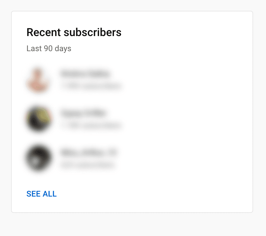 Aby zobaczyć swoich subskrybentów YouTube, znajdź środkową kolumnę i poszukaj karty „Ostatni subskrybenci” na dole.