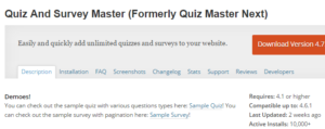 O Quiz and Survey Master tem mais de 10.000 instalações ativas e uma classificação de 4,9 estrelas. Este plug-in permite adicionar um número ilimitado de questionários e pesquisas ao seu site instantaneamente. Ele vem com uma versão gratuita completa e complementos premium, que começam em $ 15 cada.