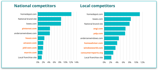 Palavras-chave locais e nacionais tendem a ter concorrentes diferentes. Veja o gráfico abaixo para uma análise dos principais concorrentes de uma marca com um site de franquia nacional e local, competindo em 188 mercados em 24 palavras-chave.