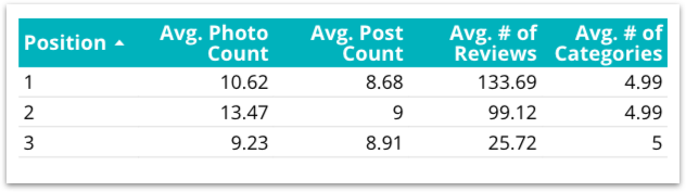 O Local SEO Guide extraiu da GBP os dados de classificação de um cliente para “unidade de armazenamento” em 50 cidades e coletou o número de imagens, número de avaliações, pontuação de avaliações, categorias e outros fatores por GBP.