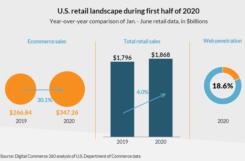 O comércio eletrônico será enorme nos próximos meses. Mesmo no primeiro e segundo trimestres, vimos um impulso sem precedentes para compras digitais e comércio eletrônico. Assim, espera-se que a mesma onda siga até o final do ano. De acordo com um relatório publicado pelo Statista Research Department (10 de agosto de 2020), intitulado Estados Unidos: vendas de comércio eletrônico de varejo 2017-2024, as vendas de varejo online dos EUA devem atingir 476,5 bilhões de dólares até 2024.