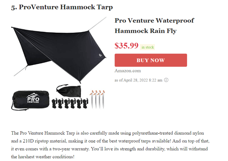 Por exemplo, um blogueiro ao ar livre pode recomendar uma barraca usando um link de afiliado da Amazon. Quem clicar na URL e comprar a barraca ganhará ao blogueiro uma comissão pela venda: