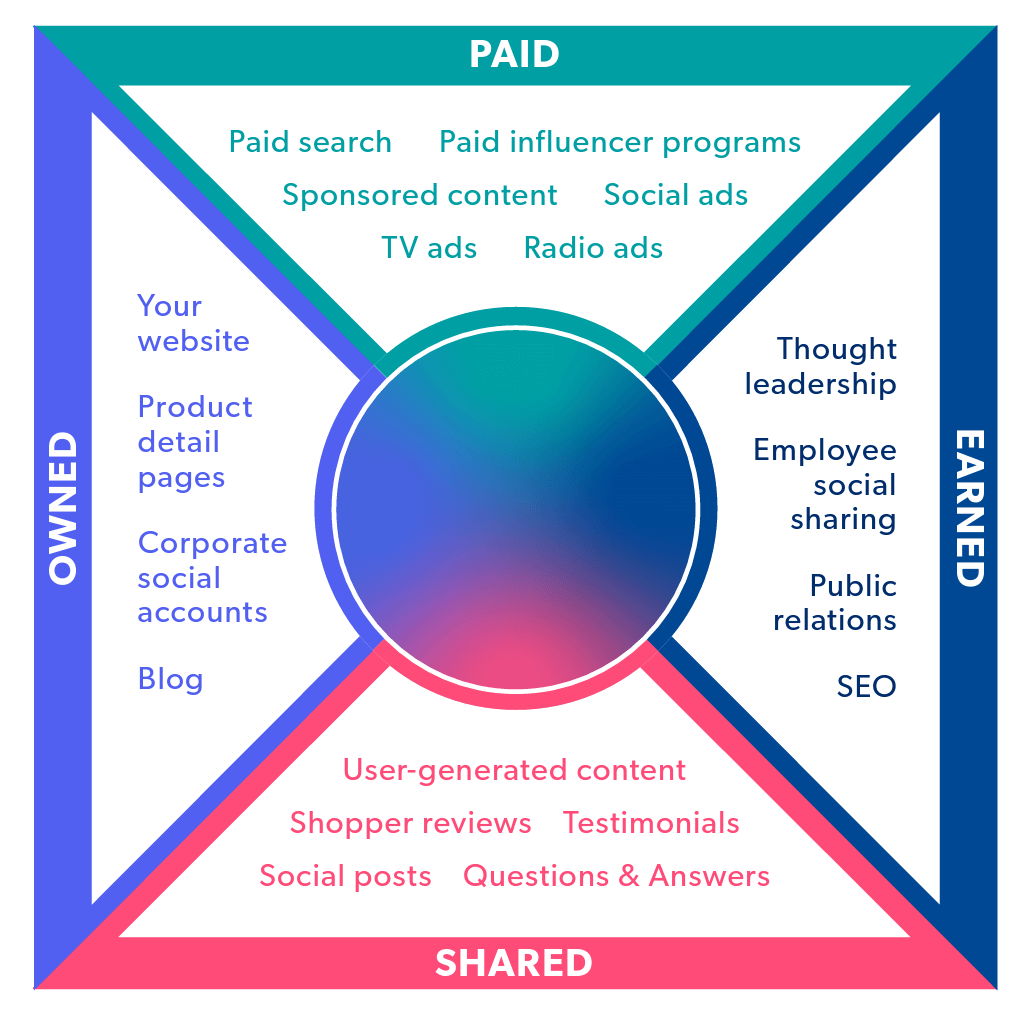 Os compradores se envolvem com o conteúdo em uma mistura de vários canais de marketing diferentes e geralmente preferem o UGC em cada estágio. Combinar canais pagos, ganhos, compartilhados e próprios ajudará você a oferecer mais personalização, otimizar a pesquisa e conectar-se com os compradores em vários pontos durante sua jornada.