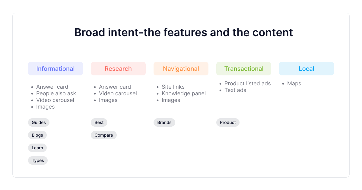 Existem 5 tipos diferentes de intenção de pesquisa , cada um com a forma de conteúdo mais adequada (conteúdo que as pessoas esperam obter para essa intenção de pesquisa). Vamos verificá-los: