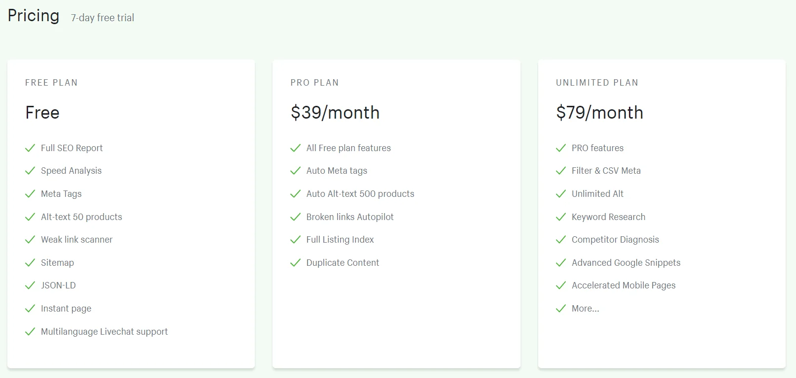 O Smart SEO ainda oferece um teste gratuito de 7 dias para você ter acesso a todos os seus recursos. Após o término do período de avaliação, você deve pagar de US$ 0 a US$ 29,99 por mês para usar o aplicativo.
