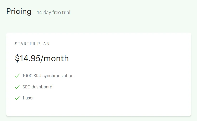Você pode optar pelo plano Starter. Ele oferece uma avaliação gratuita de 14 dias e sincronização de 1000 SKUs, painel de SEO para um usuário com US$ 14,95/mês após o término da avaliação.