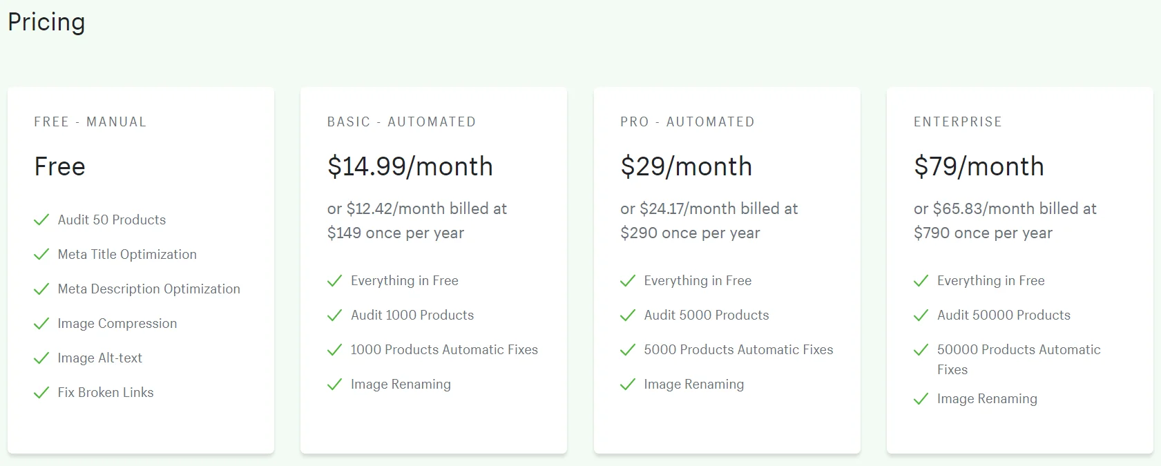 O SEO Doctor tem planos gratuitos e pagos para os comerciantes escolherem. A principal diferença aqui é a automação. Com o plano gratuito, você precisa executar a auditoria de SEO do seu site manualmente. Para o plano pago, você pode corrigir automaticamente problemas de SEO atuais e futuros que podem surgir ao adicionar novos produtos à sua loja.