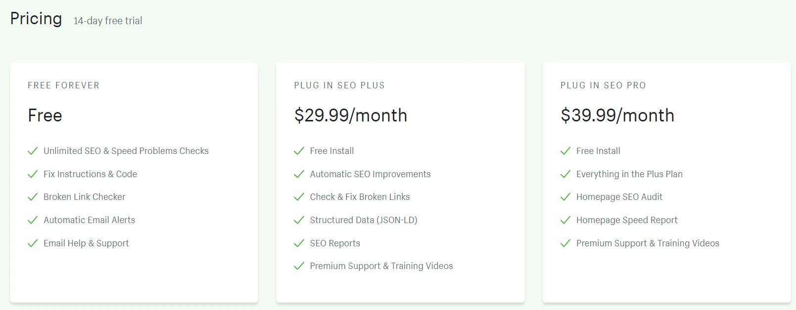 Felizmente, o aplicativo Plug In SEO ainda possui um plano gratuito para você verificar problemas de SEO em seu site com instruções, alertas por e-mail e suporte da equipe. Se você pagar pelo plano Plus, que custa US $ 29,99 por mês, e pelo plano Pro, por US $ 39,99 / mês, poderá acessar totalmente todos os seus recursos avançados.