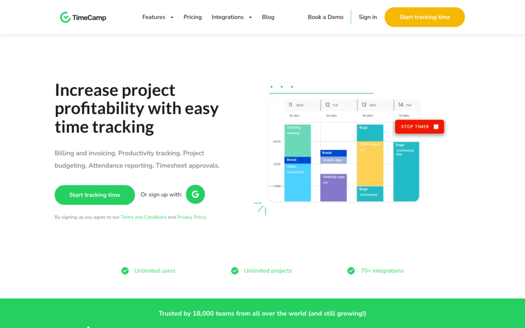 O TimeCamp é um aplicativo de cartão de ponto apoiado por um conjunto de recursos de RH e gerenciamento de funcionários . Ele oferece várias integrações para agilizar a folha de pagamento e outros fluxos de trabalho do dia a dia.