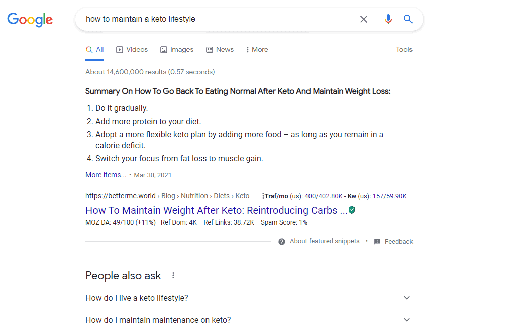 Por exemplo, o tipo de conteúdo mais adequado para a palavra-chave “como manter um estilo de vida cetônico” é uma postagem de blog.